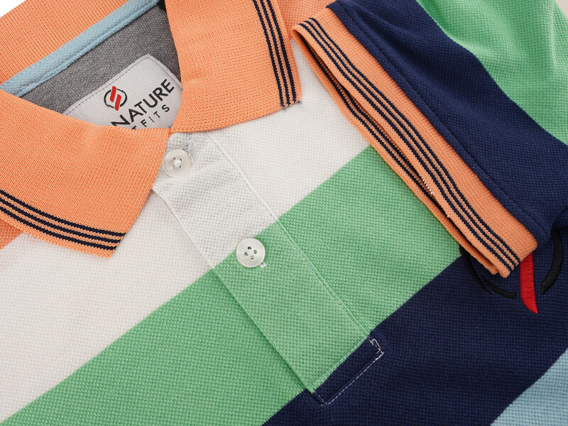 This polo shirt features a stylish, multi-colored striped design in shades of green, navy blue, light blue, and tan, making it a perfect choice for a summer wardrobe. Crafted with premium quality fabric, it offers both comfort and a polished look. The shirt has a classic collar with a two-button placket and a small embroidered logo on the chest. Ideal for casual outings or semi-formal occasions, this polo combines fashion with functionality.