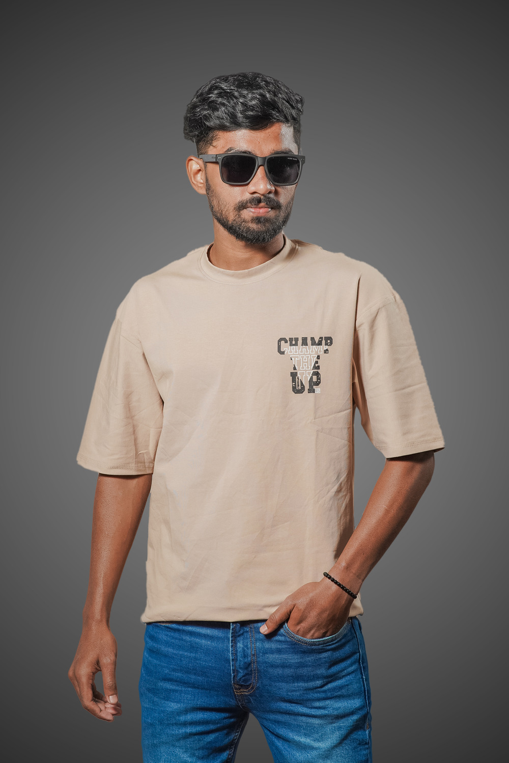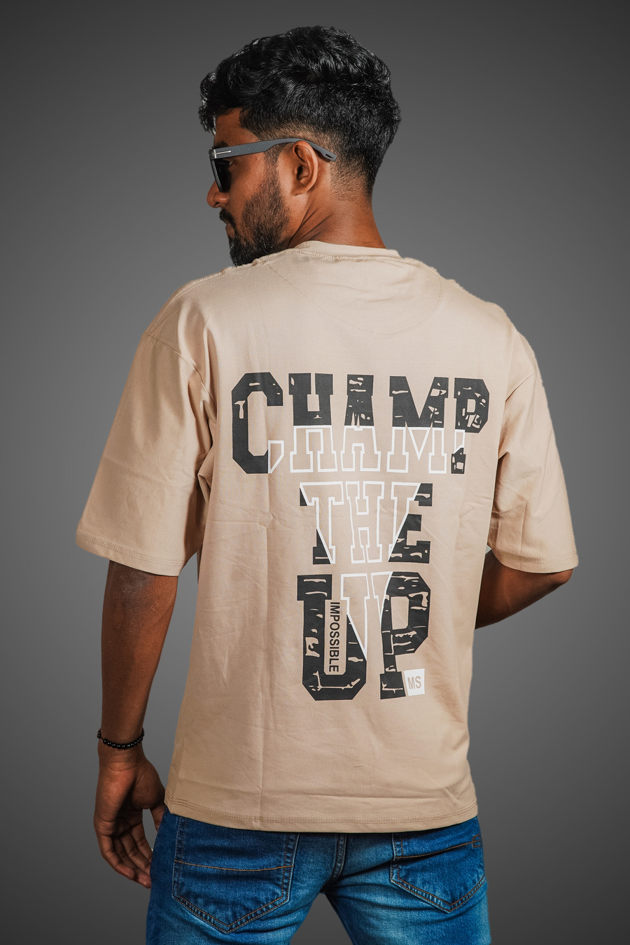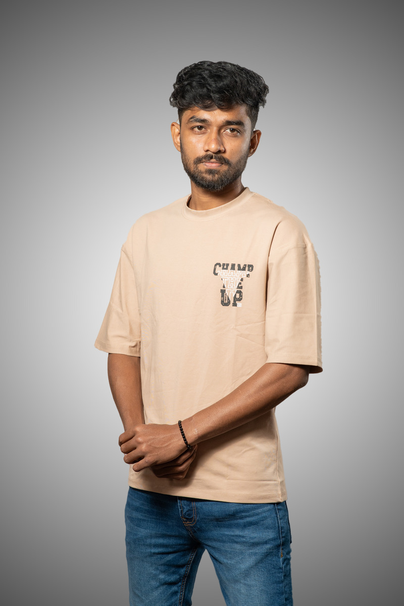 The drop-shoulder design and loose fit provide an effortlessly cool, streetwear-inspired aesthetic, allowing for easy movement and layering options. A standout feature is the minimalist chest print, "CHAMP THE UP," which adds a touch of modern style without overpowering the simplicity of the design.