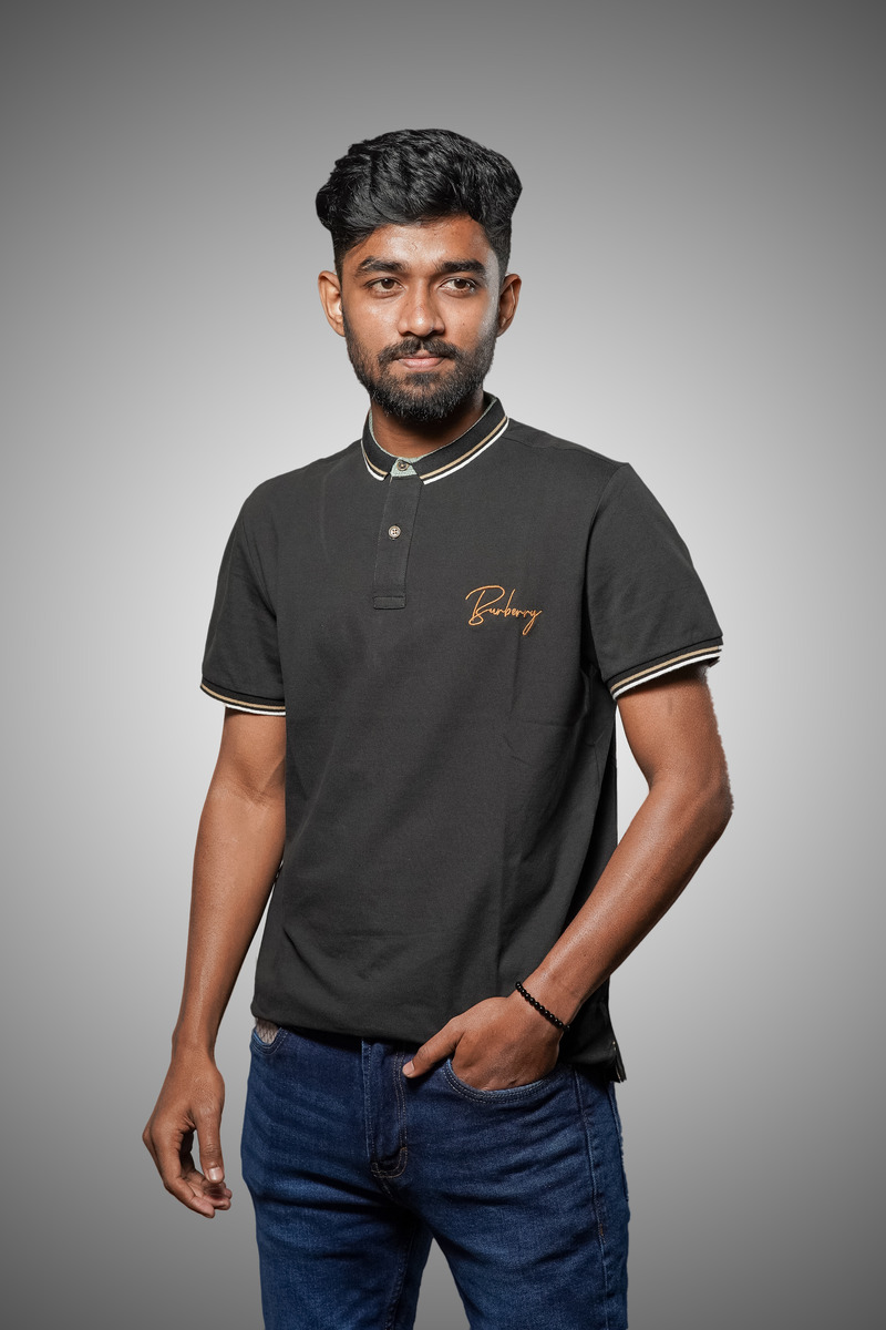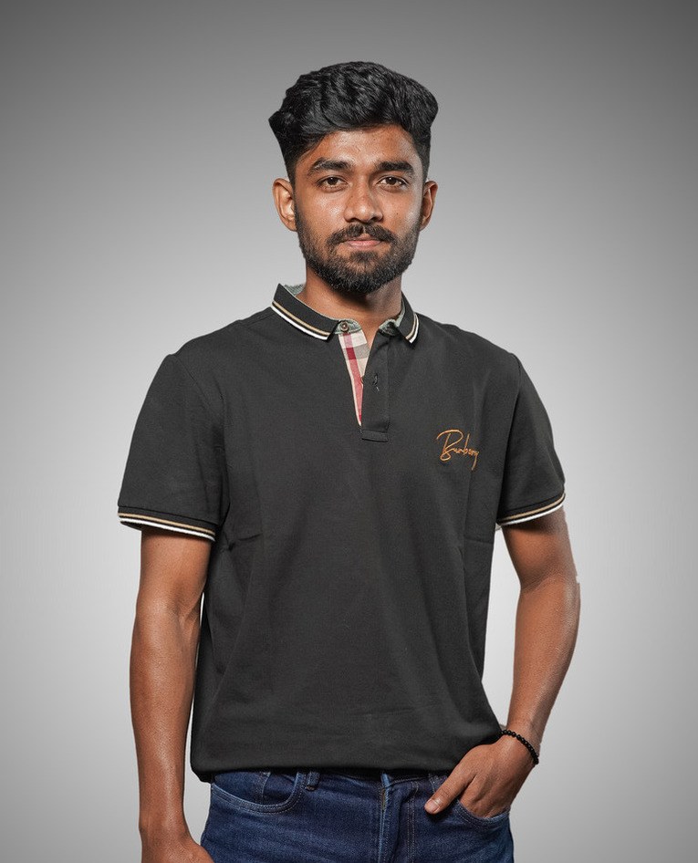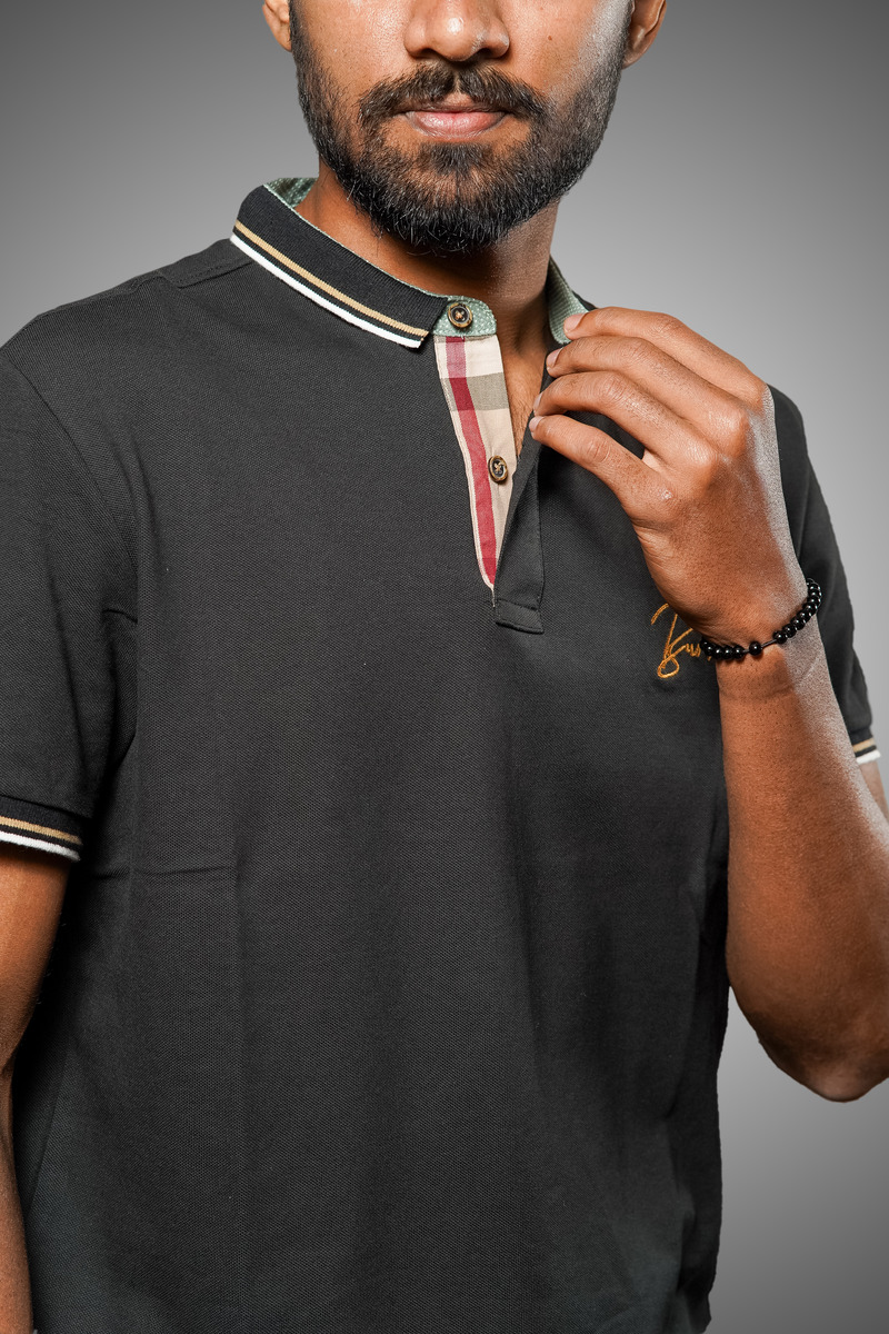 This premium Burberry polo shirt exudes sophistication with its sleek black design and finely crafted details. The chest features an elegant gold-embroidered Burberry logo, adding a touch of luxury. The ribbed collar and sleeve cuffs are accented with stylish gold and white stripes, enhancing its refined appeal. Designed for both comfort and style, this polo shirt is made from high-quality fabric, ensuring a soft feel and a perfect fit. Ideal for casual outings or semi-formal occasions, it effortlessly combines modern fashion with timeless elegance, making it a must-have in any wardrobe.