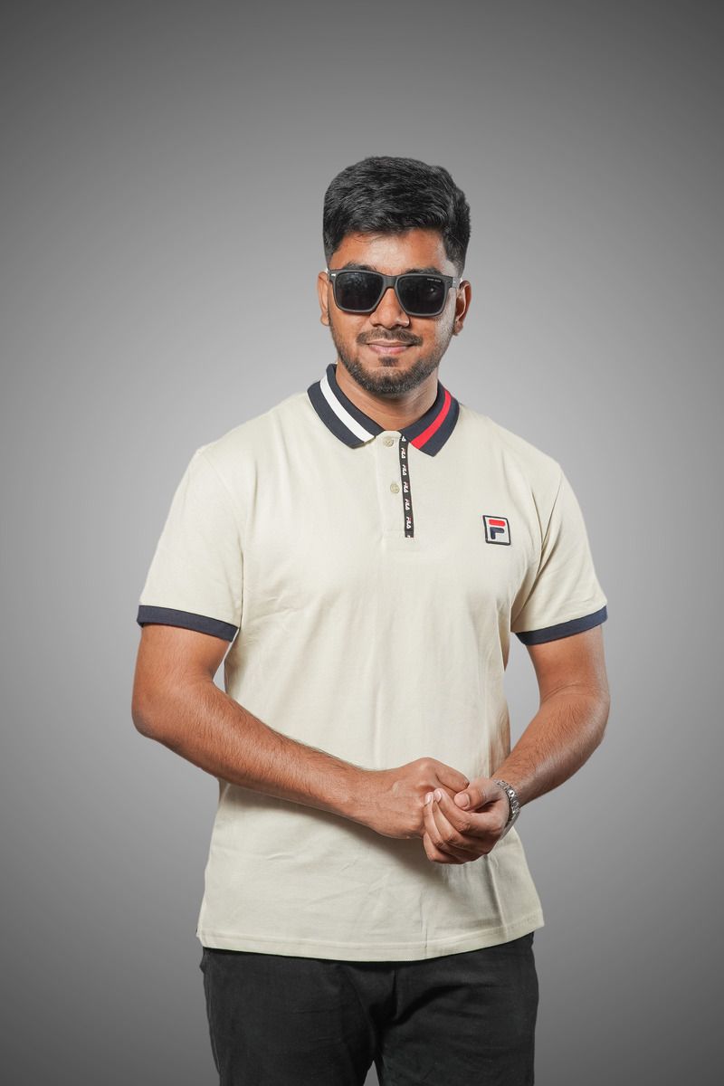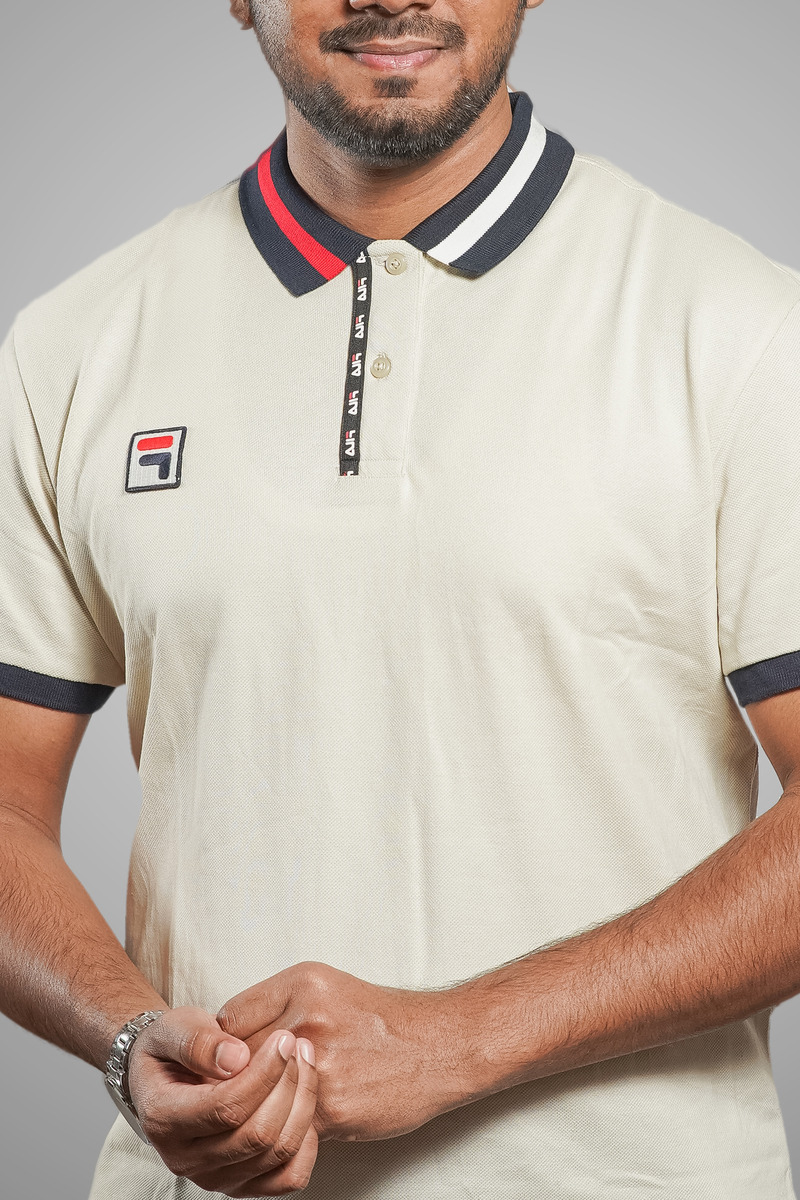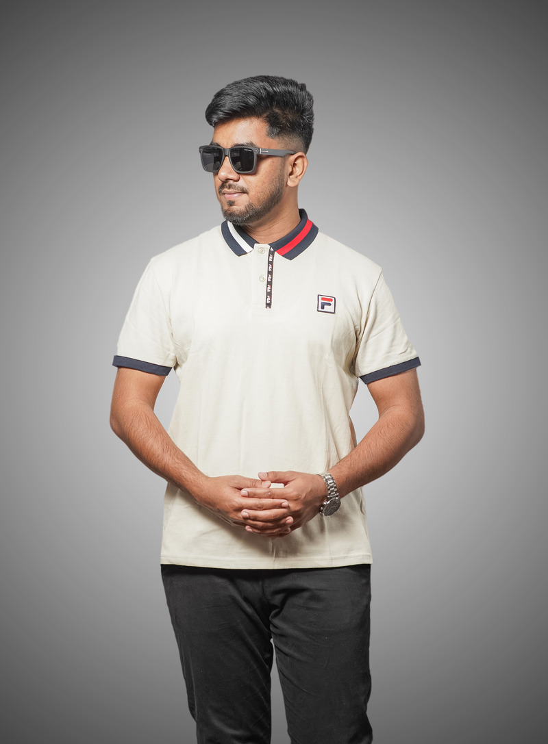 This premium FILA polo shirt exudes a blend of sporty elegance and modern style. Made from high-quality fabric, it features a classic off-white color with a contrasting navy and red striped collar, adding a sophisticated touch. The iconic FILA logo is subtly embroidered on the left chest, enhancing its brand appeal. The buttoned placket is detailed with FILA-branded taping, showcasing a refined yet casual look. The short sleeves are finished with matching navy trims for a sleek finish. Perfect for casual outings or semi-formal occasions, this polo shirt is a must-have for those who appreciate both comfort and fashion.