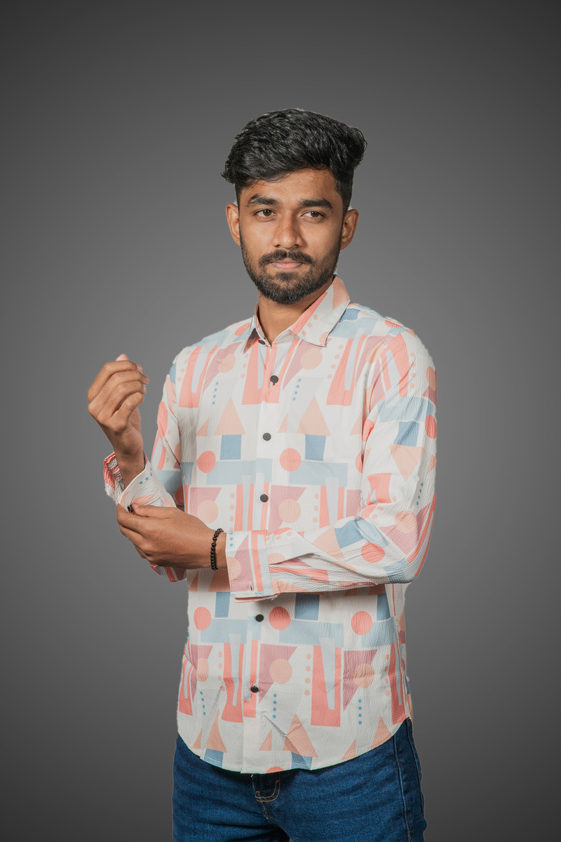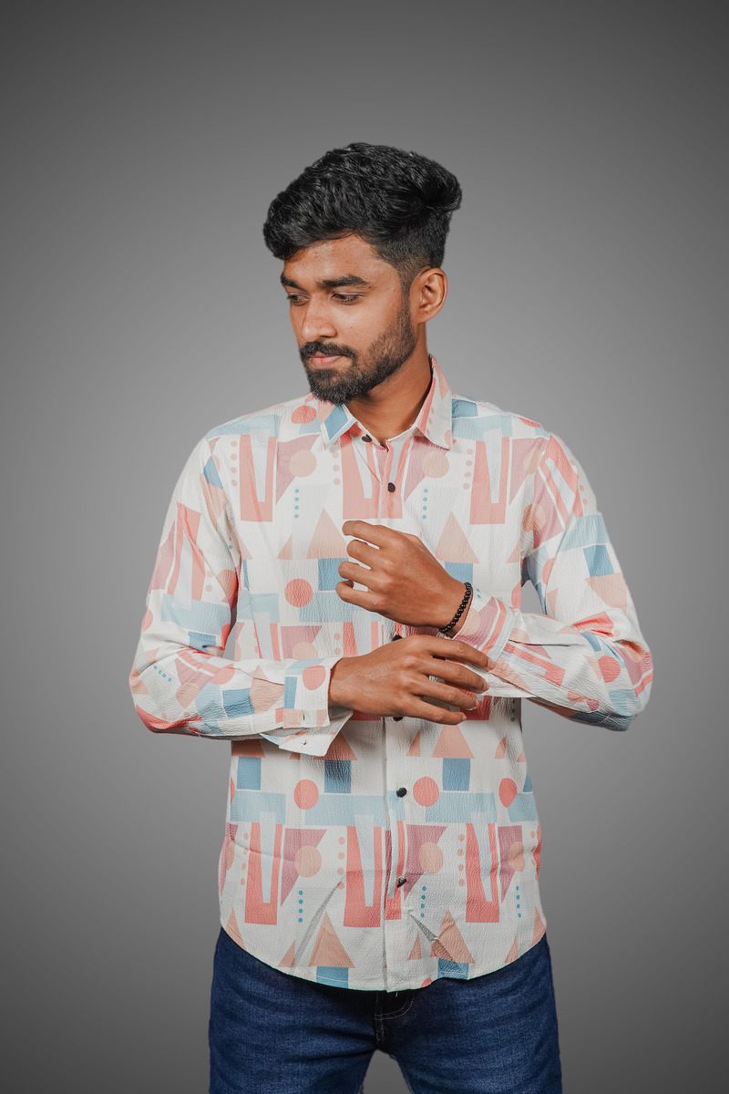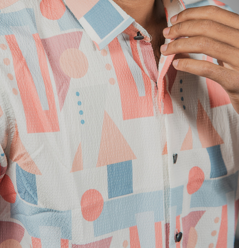 This casual shirt features a vibrant, geometric pattern with a mix of pastel shades, including light blue, peach, and coral. The design incorporates abstract shapes like triangles, circles, and rectangles, giving it a modern, artistic vibe. It has a button-down front with contrasting dark buttons that add a subtle detail to the light-colored fabric. The shirt is made from a textured, lightweight material, perfect for a relaxed, comfortable fit. The sleeves are rolled up, adding to the laid-back, casual style, making it ideal for informal gatherings or weekend outings.