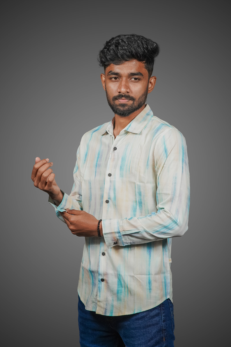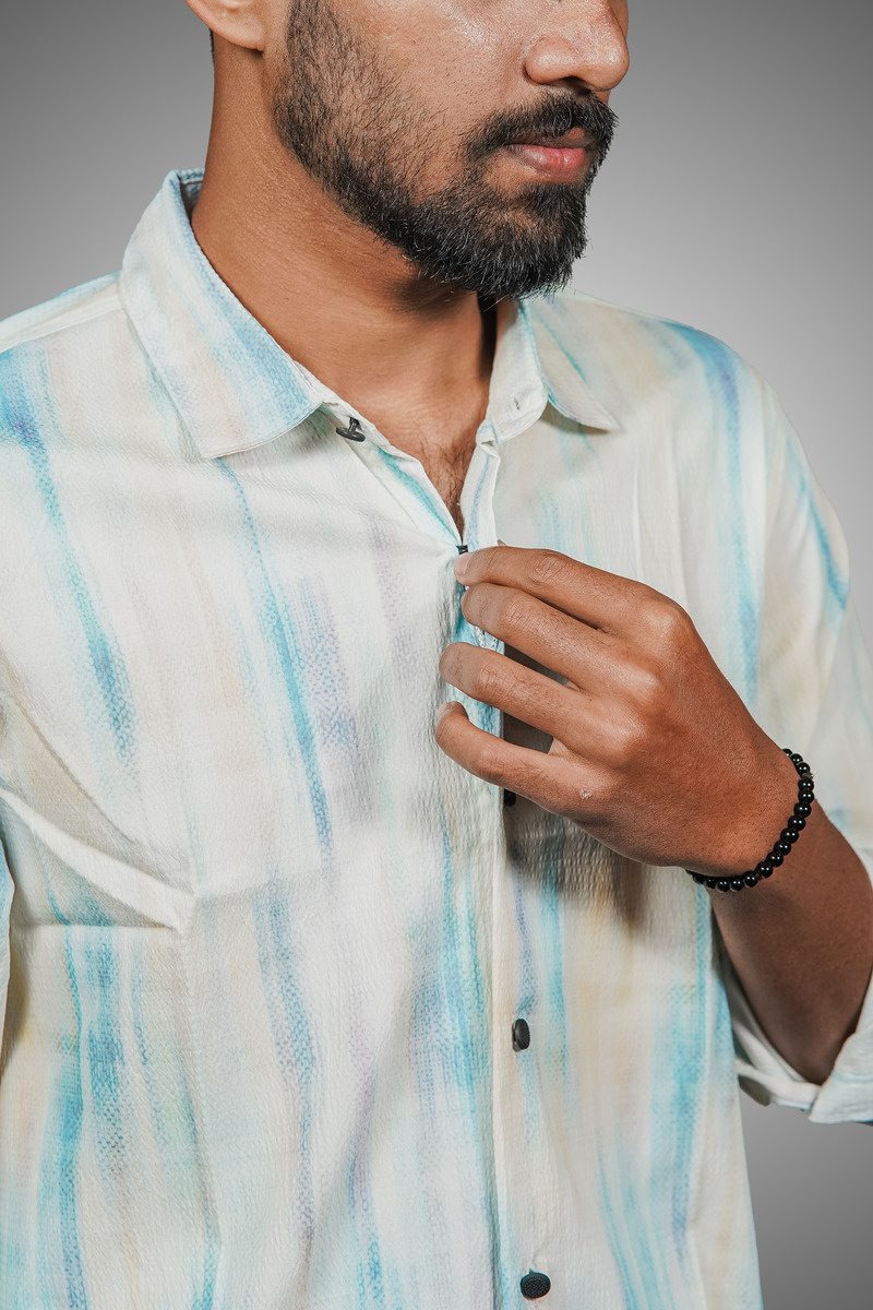 This casual shirt features a unique, watercolor-inspired vertical stripe pattern in soft shades of teal, blue, and beige, giving it a fresh and relaxed vibe. The lightweight, textured fabric offers breathability and comfort, perfect for warm weather or casual outings. It has a button-down front with contrasting dark buttons that add a bold touch to the light-colored design. The shirt also includes long sleeves with adjustable buttoned cuffs, allowing for versatile styling—whether worn rolled up for a laid-back look or buttoned for a more polished appearance. Its modern yet understated design makes it easy to pair with jeans or chinos for a stylish, effortless outfit.