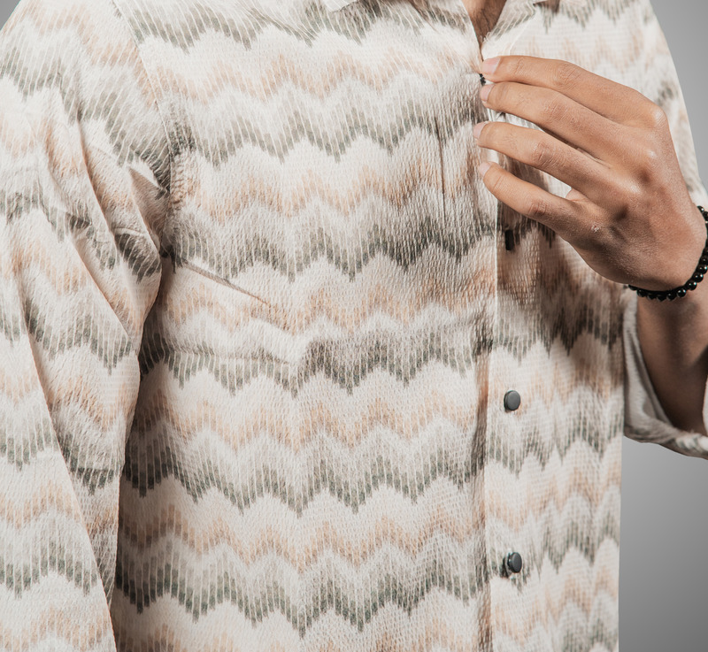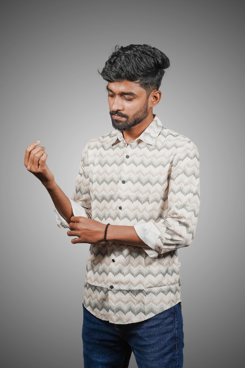 This casual shirt is a perfect blend of comfort and style, designed to elevate your everyday look. It features an eye-catching zigzag pattern in soothing earthy tones of beige, brown, and grey, giving it a modern yet versatile appeal. The shirt is crafted from soft, breathable fabric, ensuring all-day comfort, whether you're at work, out with friends, or attending a casual event.
