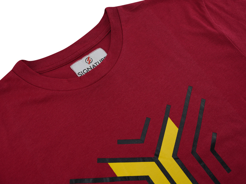 This is a premium-quality maroon T-shirt designed for summer wear, available from Signature Outfits. It features a stylish, geometric graphic in black and yellow on the chest, giving it a bold, modern look. The shirt has a classic crew neck and short sleeves, making it comfortable and breathable for warm weather. The sleek, minimalist design makes it versatile for casual outings or as a statement piece in a relaxed outfit.
