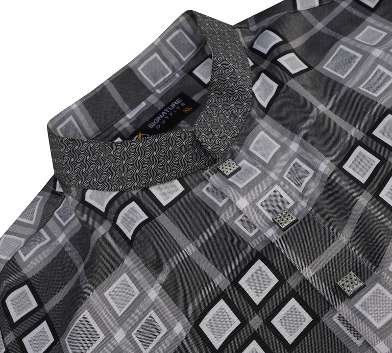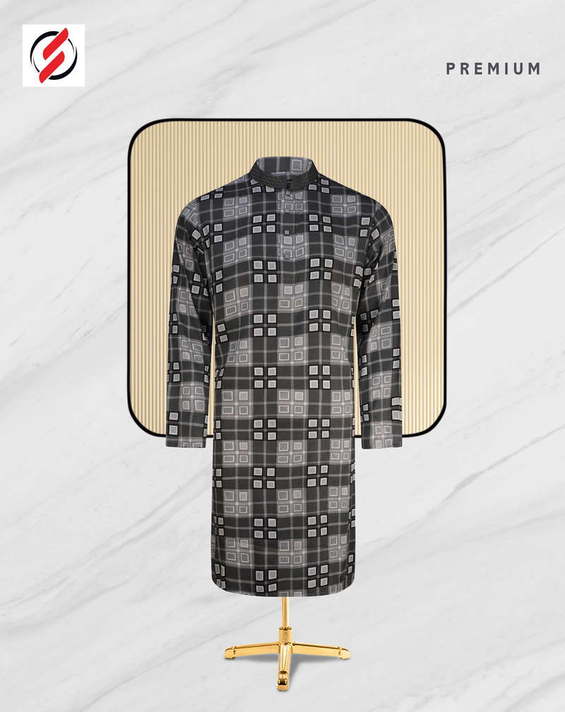 This premium printed fabric Panjabi features an elegant pattern with a sophisticated touch. The design is elevated by a stylish contrast on the collar and button placket, adding a refined appeal. The neck and buttons are adorned with premium snap buttons, combining style and convenience in this traditional yet modern garment. Perfect for festive or formal occasions, this Panjabi merges tradition with high-quality details for a truly distinguished look.