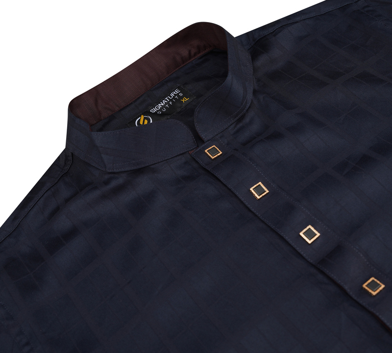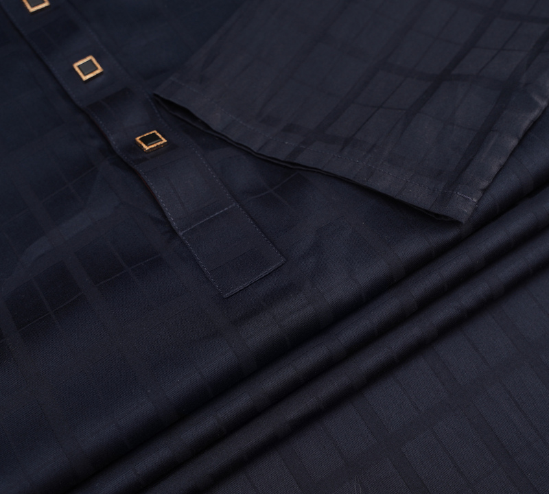 This elegant Panjabi is crafted from premium fabric with a subtle checkered print, giving it a modern, sophisticated look. The design is enhanced by a stylish contrast on the inner collar, while the front placket is adorned with distinctive square snap buttons, adding a refined touch. Ideal for both formal and festive occasions, this Panjabi combines a sleek, minimalist aesthetic with quality detailing for a polished appearance.